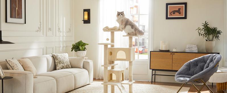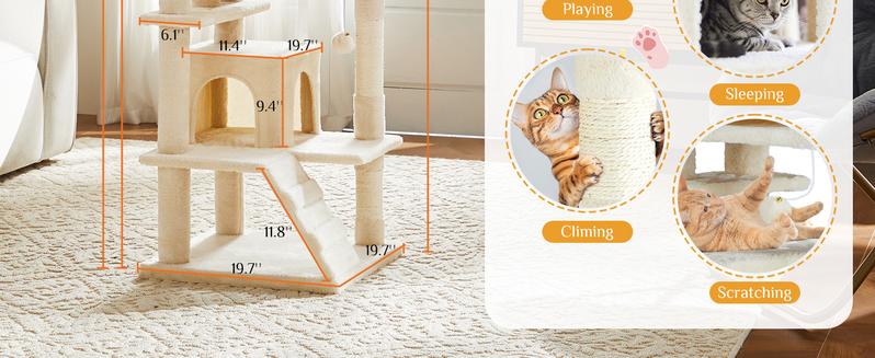 With three sisal rope pillars,your furry kids can satisfy their natural scratchinginstincts. The dangling balls, complete with delightfulbells, ensuring cats can experience the thrill of the huntanytime they please. And the cleverly designed rampmakes climbing an absolute breeze, adding an extra dashof adventure to their playtime.γHigh-quality Materialγ