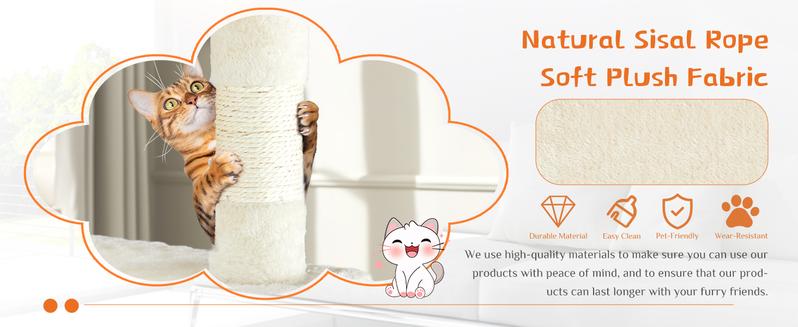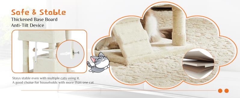 We only use pet-friendlymaterials for better products. The cat tower is covered inthick, plush fabric to keep your furry friends warm andcomfortable. The scratching posts are wrapped in naturalsisal rope, ensuring safety and durability. And toguarantee stability, the base board is reinforced withmultiple layers of thick material.γStable & Space Savingγ